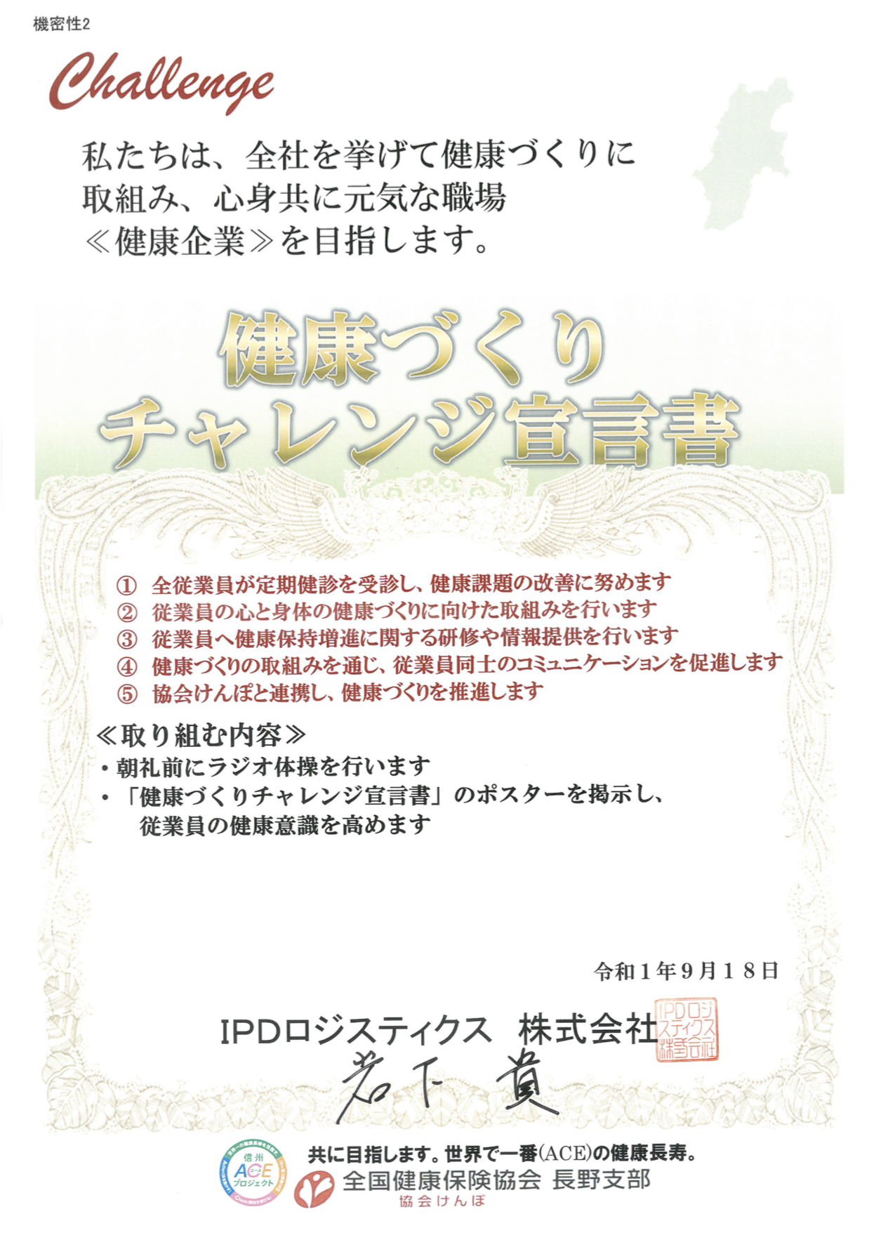 IPDは全社を挙げて健康づくりに取り組み心身ともに元気な職場《健康企業》を目指す宣言をしまして、全国健康保険協会長野県支部から認定を受けました。